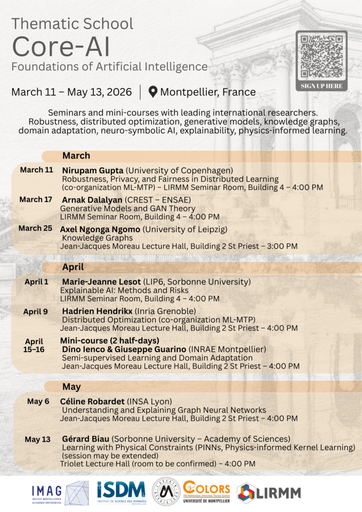 Nous avons le plaisir d’annoncer l’ouverture de l’École Thématique Core AI 2026, un cycle de séminaires et de mini-cours financé par le Projet Thématique Long COLORS et consacré aux fondements de l’intelligence artificielle, réunissant des chercheuses et chercheurs internationaux de premier plan.